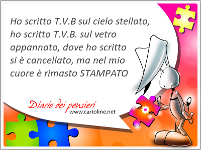 Ho scritto T.V.B sul cielo stellato, ho scritto T.V.B. sul vetro appannato, dove ho scritto si è cancellato, ma nel mio cuore è rimasto STAMPATO